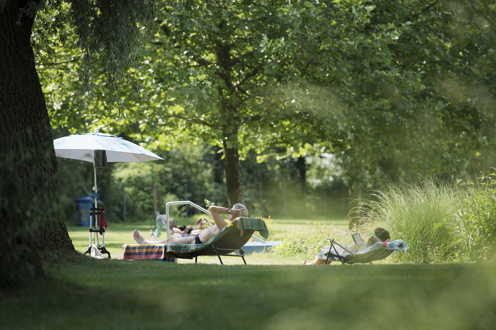 Unsere Liegeflächen laden zum Entspannen ein, mit zahlreichen schattenspendenden Bäumen. Es gibt Bereiche für Familien, Sportler und auch ruhesuchende Personen.